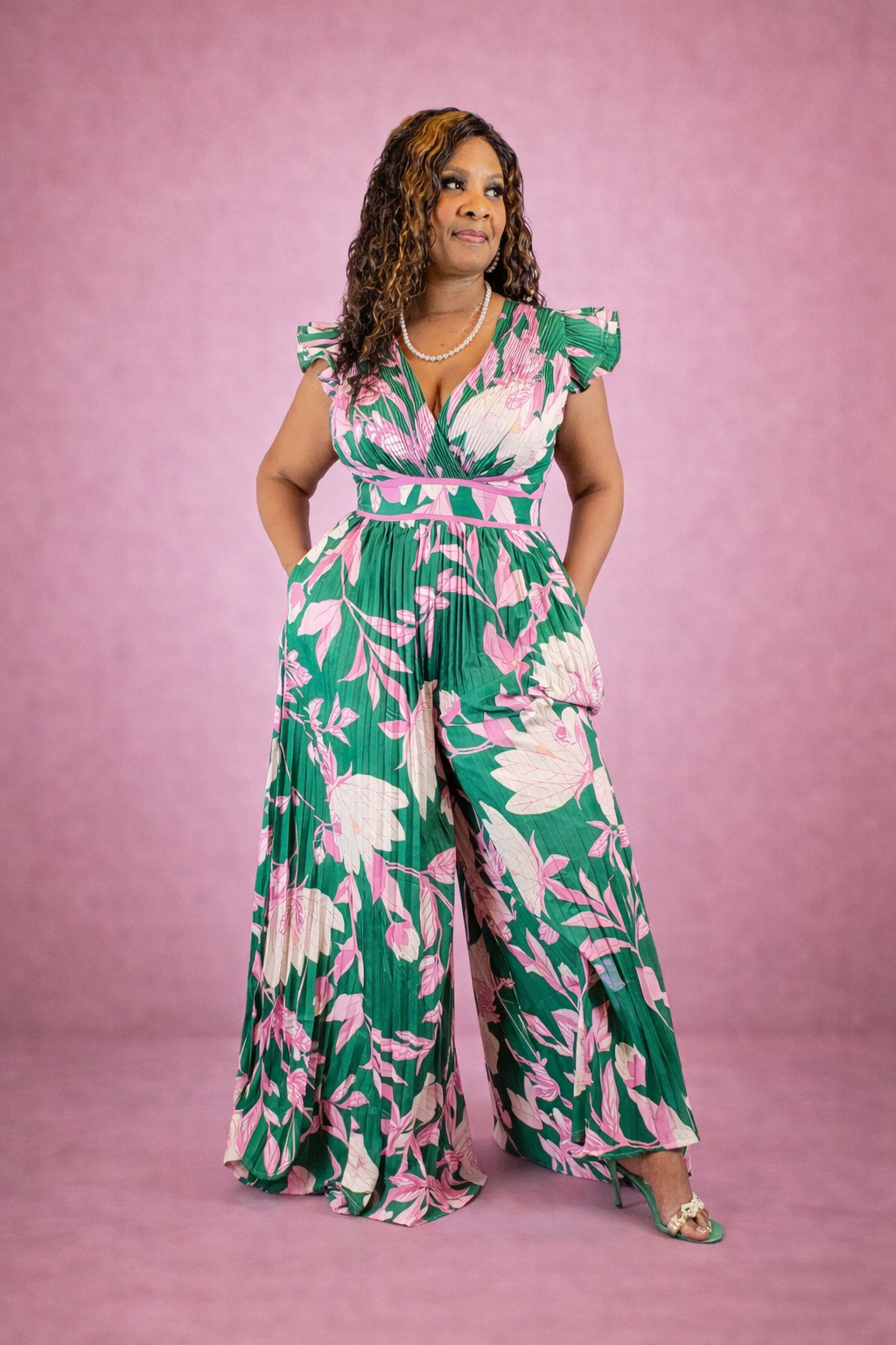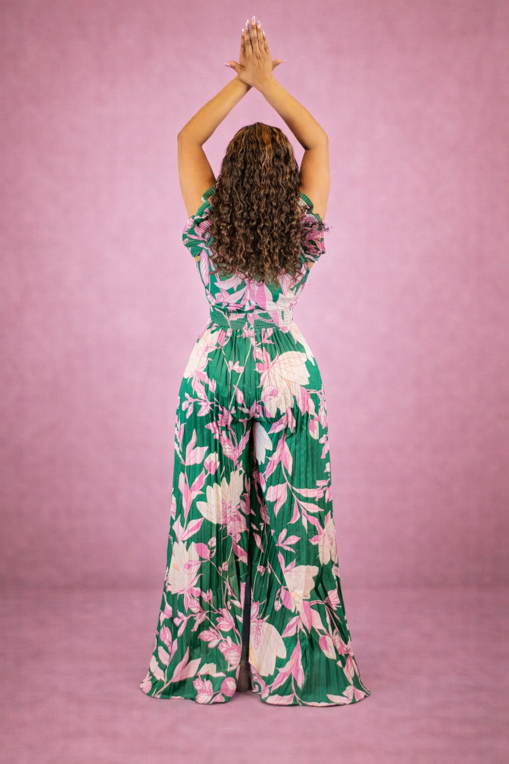 Designed to move with you, this statement floral jumpsuit blends comfort, confidence, and undeniable style. Featuring a flattering wrap-style bodice, soft pleating through the legs, and a cinched waist that defines your shape, this piece was made for moments when you want to feel powerful and feminine at the same time.