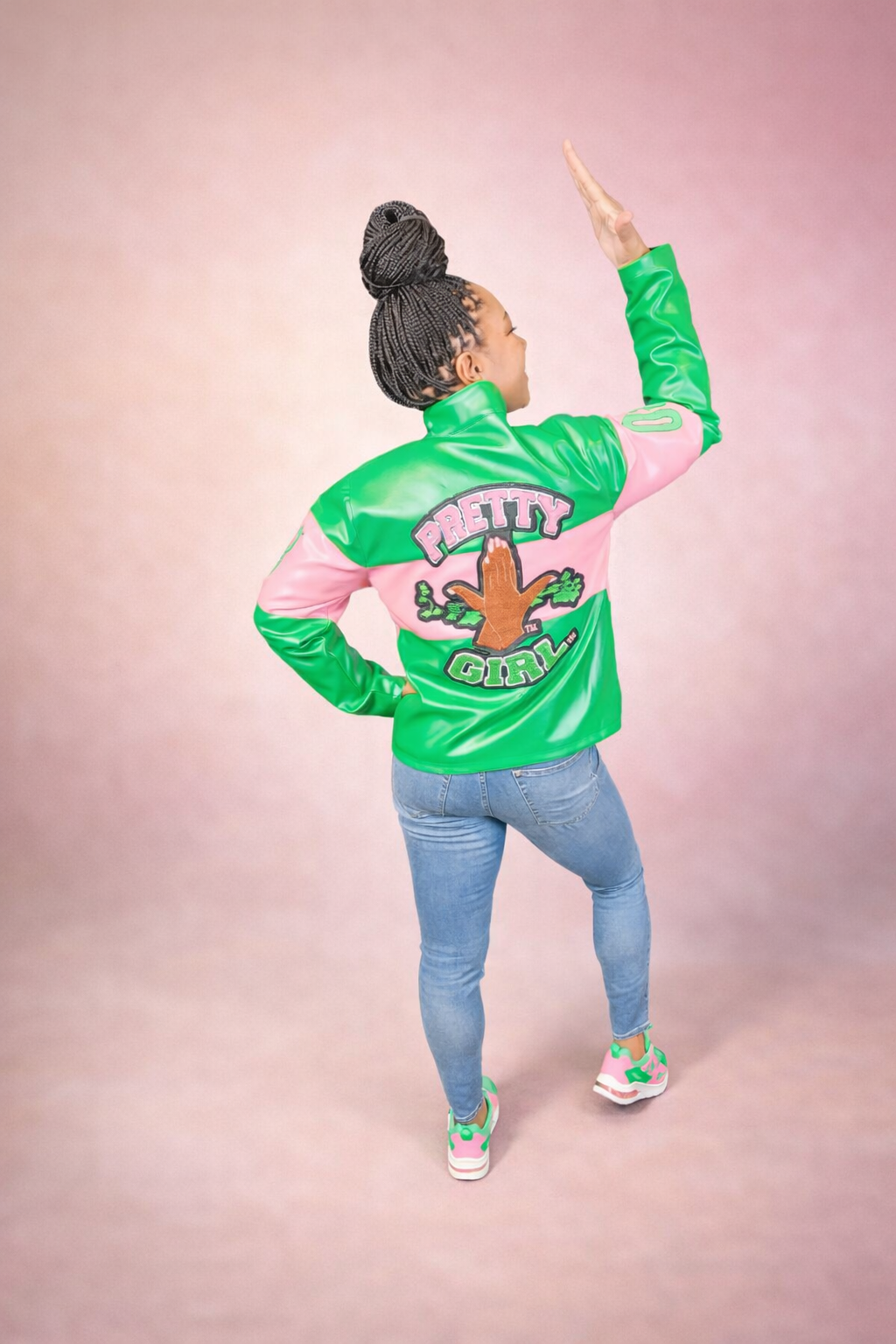 The Alwaze Skee Wee Vegan Leather Racer Jacket is where classic sorority pride meets street-luxe edge. Designed in our signature pink and green colorway, this standout piece commands attention from every angle. The sleek vegan leather finish delivers a polished, elevated look, while the racer-style silhouette keeps it sporty and fresh.