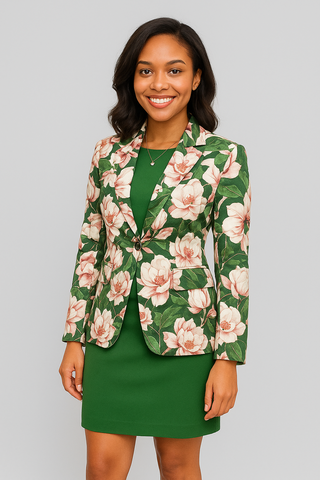 Turn heads in our tailored Floral Blazer, designed with a sleek, structured silhouette that flatters every curve. The rich green base paired with soft blush floral detailing creates a timeless, feminine look perfect for conferences, brunch, chapter events, or polished everyday style.