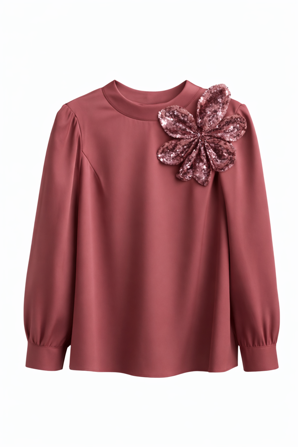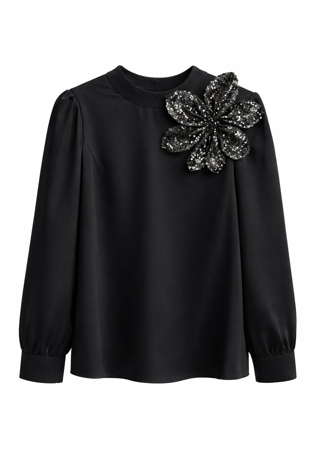 Designed for presence, this satin top blends soft structure with statement detail. The smooth satin drape is elevated by a sculpted sequin floral appliqué, adding dimension and quiet shine where it counts. Effortless yet expressive, it’s the kind of piece that speaks without trying.