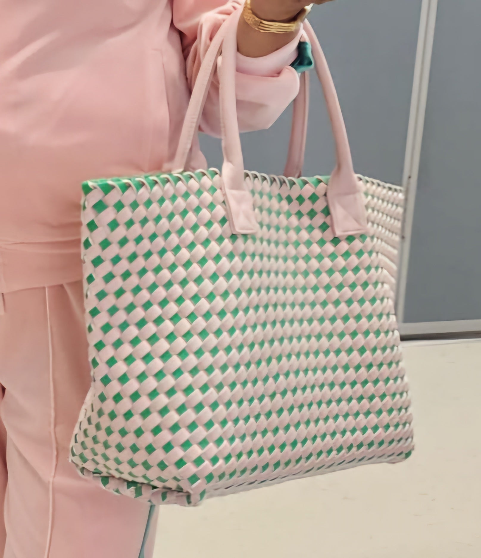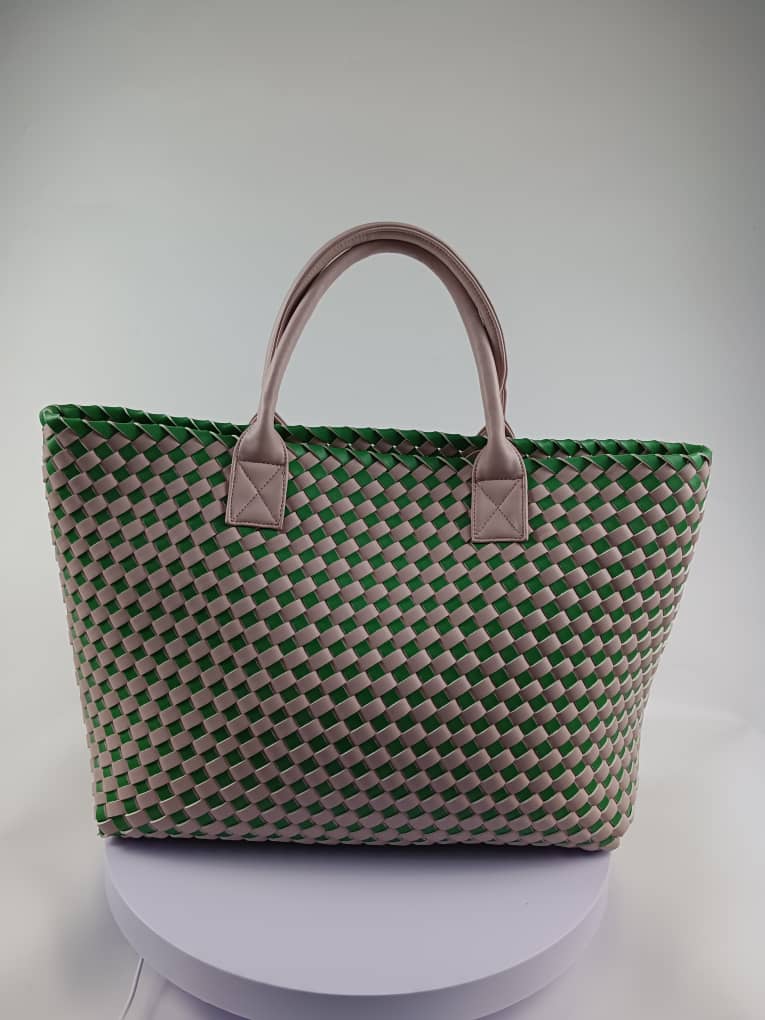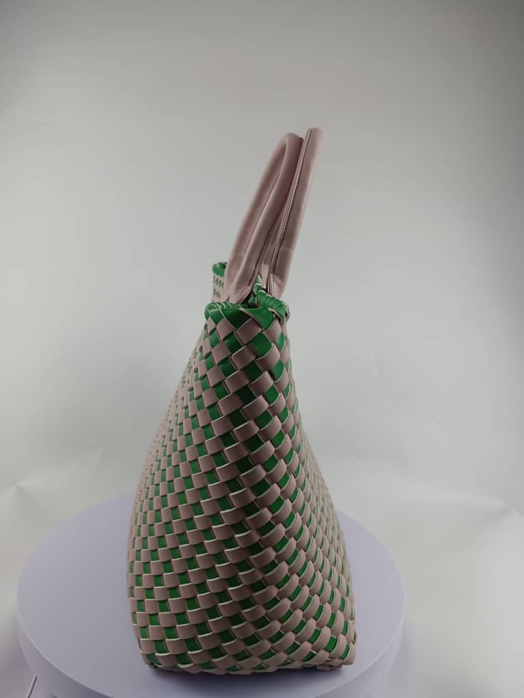 The Pink and Green Weave Vegan Leather Tote is a chic, hand-woven carryall that blends soft pink with rich green for a fresh, modern look. Made from durable vegan leather, it's lightweight, spacious, and easy to carry with reinforced top handles. Perfect for everyday errand, work, or weekend outings. A stylish sustainable go-to for any reason.